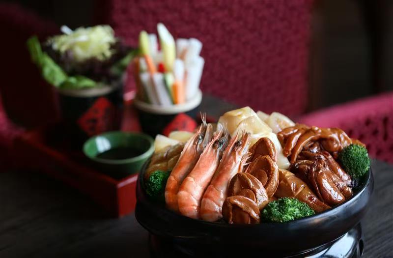 滿堂彩以傳統佳餚喜迎馬年,新春盆菜匯聚吉祥食材,包括發菜金蠔拼花膠蠔皇扣花菇鹅掌”及“鮑魚红燒肉”,象徵闔家團圓、滿堂吉慶。新年特別菜單更呈獻多款深受賓客喜愛的經典美饌,共享團圓盛宴,傳遞幸福與美好祝願。