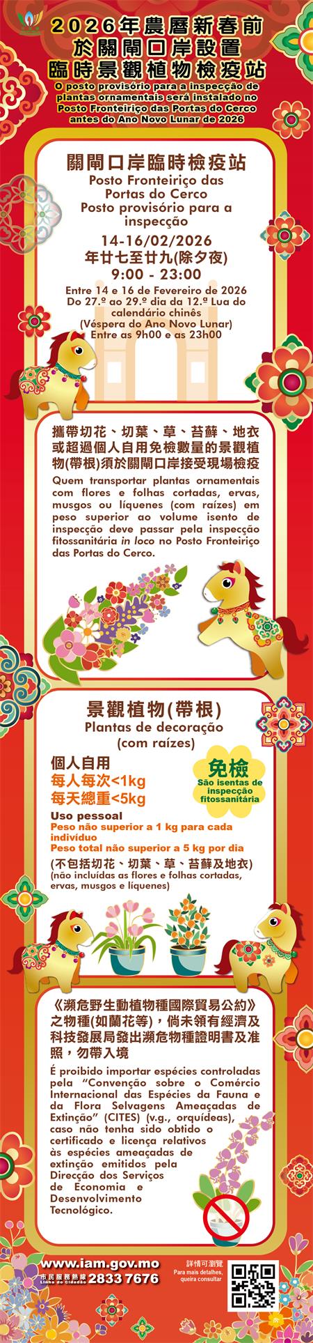 臨時景觀植物檢疫站只設於關閘口岸,運作時間由二月十四日至十六日,每日上午九時至晚上十一時。市民如攜帶年花回澳,須注意所攜帶入境的植物僅供個人自用,當每名入境人士攜帶的景觀植物(帶根)每次不超過一公斤、每日攜帶總重量不超過五公斤時,不用接受檢疫。但切花、切葉、草、苔蘚、地衣及超過免檢數量的景觀植物(帶根),則須於關閘口岸接受現場檢疫。凡須依法接受植物檢疫而沒有檢疫之進口景觀植物,將由具監察職權的主管當局扣押處理,而具權限當局亦會依法對違法者追究法律責任。