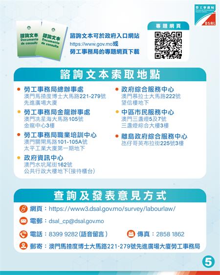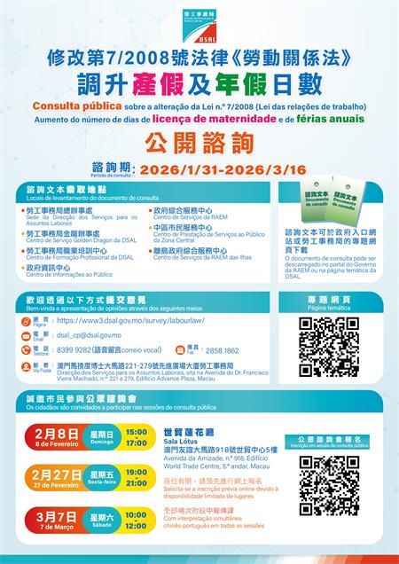 公開諮詢期為2026年1月31日至3月16日,為期45天。特區政府已將諮詢文本、圖文包、宣傳片等資訊上載於專題網頁(https://www3.dsal.gov.mo/survey/labourlaw/),歡迎公眾透過專題網頁、電郵、電話、傳真及郵寄,以及報名出席公眾諮詢會踴躍發表意見。