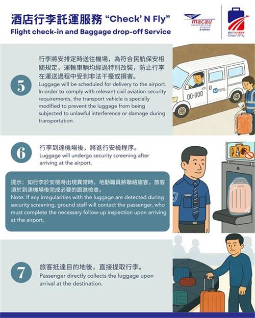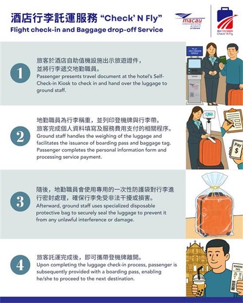 此服務經機場各相關營運商超過半年的協調後,首階段正式於澳門新口岸智選假日酒店及澳門皇冠假日酒店推出,暫適用於乘坐澳門航空的航班,未來將陸續增加其他航空公司及擴大提供服務酒店範圍。服務時間為每天上午8時15分至下午5時50分。服務流程簡單便捷,機場地勤職員在酒店內的自助值機設備協助旅客完成值機手續,並為行李稱重,隨後列印登機證及行李標籤。託運行李將由地勤職員接收並妥善保存,隨後運送至澳門國際機場進行安全檢查。若行李通過安檢,將直接運送至目的地;若需進一步檢查,地勤人員將聯絡旅客到達機場後配合開箱查驗。為慶祝服務啟用,由2026年1月至3月,每件行李優惠價為澳門元40元。在優惠期結束後,每件行李收費為澳門元70元。