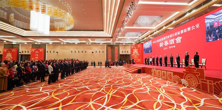 【本報訊】2月5日下午,中央政府駐澳門聯絡辦公室舉辦2026年新春酒會。受中央港澳辦主任、國務院港澳辦主任夏寶龍委托,中央港澳辦副主任、國務院港澳辦副主任,中央政府駐澳門聯絡辦公室主任鄭新聰代表夏寶龍主任、中央港澳辦、國務院港澳辦和中央政府駐澳門聯絡辦公室向廣大澳門居民致以新春祝福。澳門特別行政區行政長官岑浩輝出席並致辭,全國政協副主席何厚鏵,前行政長官賀一誠,外交部駐澳門特派員公署特派員卞立新,解放軍駐澳門部隊司令員于長江、政委林慶華,中央政府駐澳門聯絡辦公室副主任黃柳權、呂玉印、張應杰,以及特別行政區立法、司法機構主要負責人,特別行政區政府主要官員,澳區全國人大代表、全國政協委員,特別行政區行政會委員、立法會議員,以及澳門社會各界代表人士約1300人出席酒會。