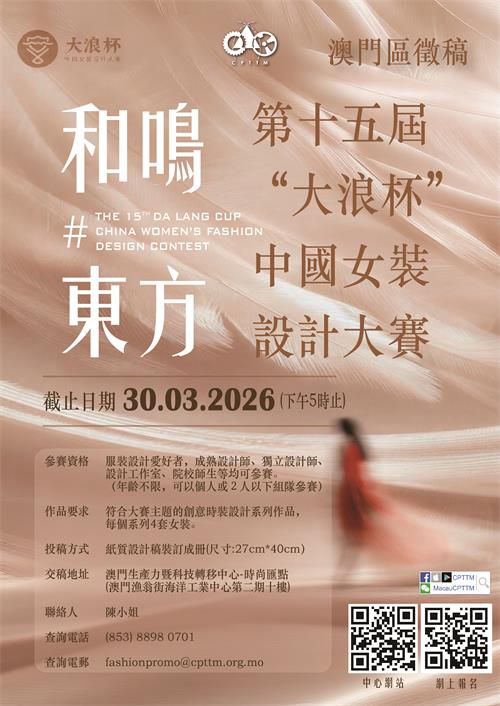生產力中心作為“大浪杯”的澳門區徵稿單位,一向支持本地設計師參與國際賽事,並為參賽者提供技術及行政等支援。有興趣投稿人士可透過生產力中心網站查詢及報名(https://events.cpttm.org.mo/competitions),截止日期為3月30日下午5時。如有查詢,歡迎於辦公時間致電8898 0701,亦可親臨生產力中心時尚匯點(澳門漁翁街海洋工業中心第二期十樓)與陳小姐聯絡。