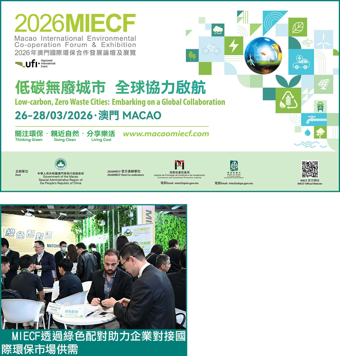 【本報訊】由澳門特別行政區政府主辦的“2026年澳門國際環保合作發展論壇及展覽”(2026MIECF)以“低碳無廢城市全球協力啟航”為主題,將於3月26至28日(周四至周六)假澳門威尼斯人金光會展舉行。