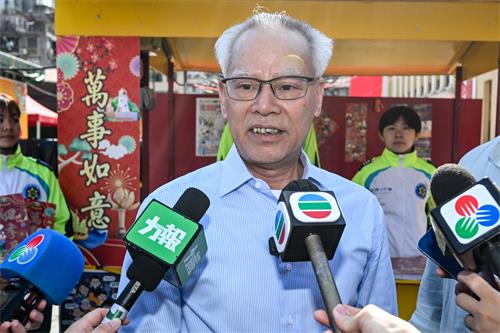 岑浩輝下午到訪塔石廣場年宵市場後接受傳媒訪問,他首先向在場記者拜年,並通過傳媒向廣大澳門市民致以新春祝福。