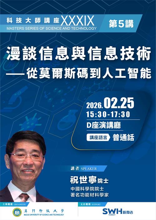 【本報訊】由澳門科技大學主辦,新偉浩進出口貿易有限公司支持的本學期第五場科技大師講座將於225日(週三)下午15:30在大學D座演講廳舉行,中國科學院院士、著名功能材料學家祝世寧院士主講。