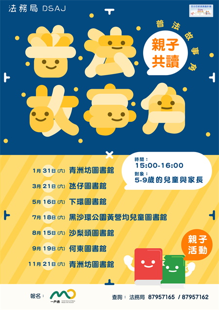 首場“普法故事角”已於1月順利舉行,其餘的場次將分別於321日、516日、718日、815日、919日和1121日舉行,歡迎本澳59歲兒童及家長參加。活動已納入“百分百家長獎勵計劃”,有興趣者可透過一戶通的“活動報名”頁面報名,每場名額10對親子,如報名人數超過限額,將以電腦抽籤方式決定,詳情請參閱活動海報。如有任何查詢,歡迎致電法務局法律推廣及公共關係廳楊小姐(8795 7162)。