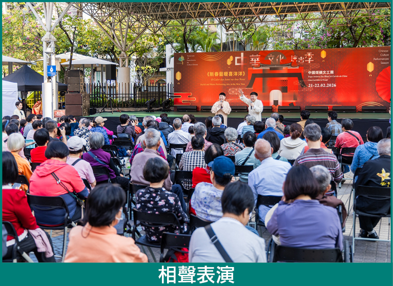 新春重頭戲《新春藝暖喜洋洋》特別邀請中國煤礦文工團來澳,於年初五至初六(2月21日至22日)分別在大炮台花園、嘉路米耶圓形地(三盞燈)、氹仔嘉妹前地(北帝廟前地)及祐漢街市公園獻上多場精彩絕倫的傳統技藝表演,包括妙趣橫生的相聲、節奏明快的快板、詼諧風趣的雙簧,以及技藝高超的空竹雜技、精彩絕倫的川劇變臉和古彩戲法等。節目充分展現中國傳統表演藝術的獨特魅力,更在社區中營造熱鬧歡騰、喜氣洋洋的節慶氛圍,現場掌聲不斷。