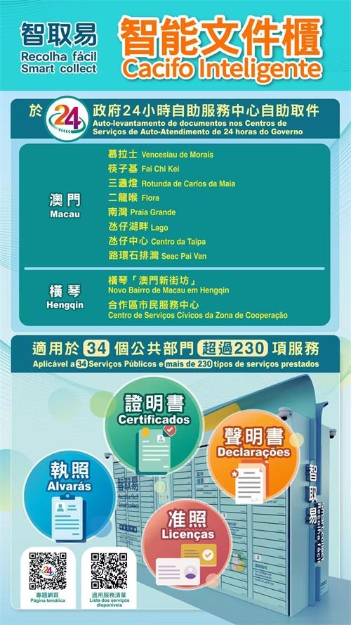 “智取易”現已進駐澳門8個政府24小時自助服務中心,並延伸至橫琴“澳門新街坊”的澳門政務24小時自助服務中心,及橫琴合作區市民服務中心,便利澳門與橫琴兩地居民,無需跨境即可領取文件。