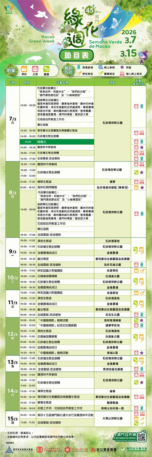 本屆綠化週於37日至15日一連九日舉行,期間將舉辦超過四十場自然主題活動,包括全新的“石排灣生態全接觸”活動,帶領公眾參觀兩棲爬蟲館、觀鳥園及蝴蝶園三個新增的設施。其他活動還包括大潭山郊野公園的大步行及護理林木活動、橫琴生態遊、濕地生態遊、觀鳥生態遊、金像農場收成日、派送植物、植樹活動、“中國植樹節”紀念封加蓋郵戳等,並豁免松山纜車及黑沙越野車場小童車的收費。活動詳情可瀏覽市政署網頁www.iam.gov.mo、澳門自然網www.iam.gov.mo/nature或致電2833 76762888 0087查詢。