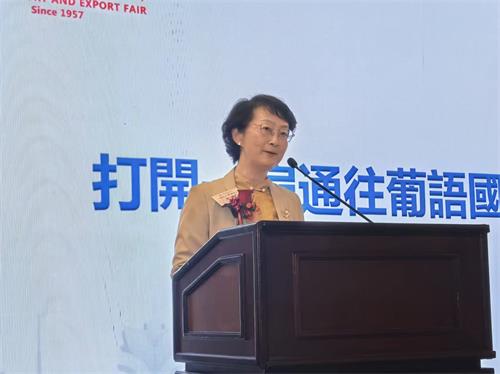 朱咏致辭中介紹了廣交會70年來的發展歷程,指出70年來澳門同胞風雨無阻與廣交會同行。她特別指出,澳門對於廣交會的意義,不僅在於帶來多少投資商,更在於它打開了一扇窗,這扇窗通往葡語世界2.6億人口市場。她表示,廣交會的未來離不開澳門的獨特價值,中國對外貿易中心將持續推動雙方深度合作。要讓廣交會這個中國重要貿易平台與中葡商貿平臺深度融合;與澳門中華總商會等機構加強合作,既服務好老朋友,也邀請新生代參與,讓澳門青年企業家站上廣交會的國際平臺。