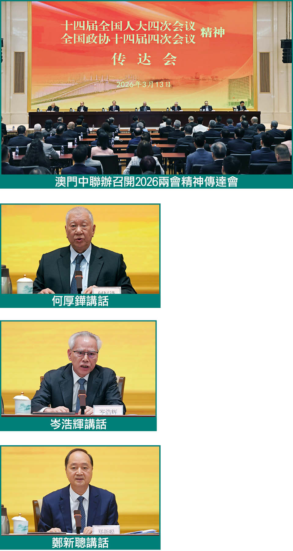 【本報訊】3月13日下午,中央政府駐澳門聯絡辦公室召開2026年全國兩會精神傳達會。全國政協副主席何厚鏵、澳門特別行政區行政長官岑浩輝、中央政府駐澳門聯絡辦公室主任鄭新聰分別講話,崔世安先生、賀一誠先生出席。澳門地區全國人大代表團團長劉藝良、全國政協常委崔世昌分別傳達十四屆全國人大四次會議、全國政協十四屆四次會議精神。外交部駐澳門特派員公署特派員卞立新,中央政府駐澳門聯絡辦公室副主任呂玉印、張應傑參加。