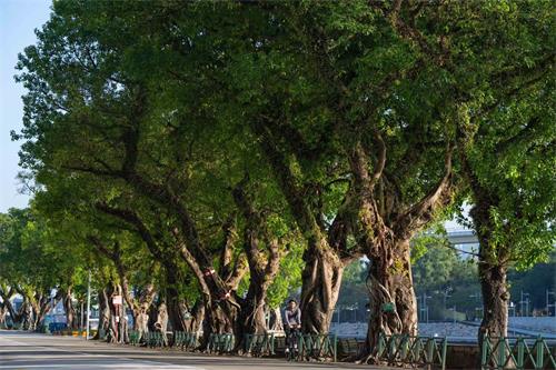 西灣湖沿岸多為住宅,堤岸上古樹成蔭。