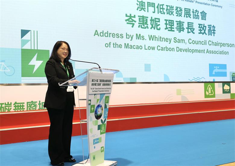 澳門低碳發展協會理事長岑惠妮致辭時指出,澳門會展業多年來一直積極推進綠色轉型,環保展台嘉許獎、綠色會展及碳中和會展標籤等項目,環保展台嘉許獎自2010年設立以來,累計頒發獎項已超1200個,助力行業實現總減碳量逾10000噸;綠色會展標籤及碳中和會展標籤自2023年底推出後,已有150個會展活動及項目成功獲得認證,累計註銷碳信用額超20000噸,綠色轉型取得顯著成效。澳門作為大灣區首個牽頭編制《粵港澳大灣區會展活動碳中和指南》的城市,更為行業樹立了重要的“澳門標準”。澳門低碳發展協會與澳門展貿協會與國際相關組織簽署合作,象徵着澳門綠色會展正式邁向國際。她並對獲獎單位在綠色會展領域的先行實踐與示範成效表示高度認可,同時也印證環保理念與商業價值可實現雙贏。未來,兩大協會將積極推動指南落地、深化區域及國際合作、培育青年綠色會展人才,持續促進行業綠色高品質發展。