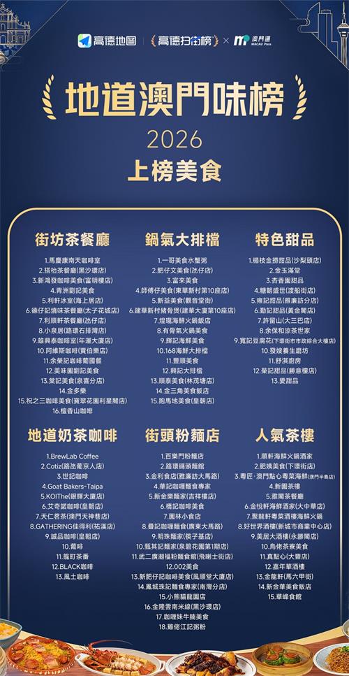 資料顯示,2025年澳門接待旅客突破4000萬人次,創歷史新高。為幫助遊客更好地“尋味澳門”,高德掃街榜上線“地道澳門味”系列榜單,涵蓋人氣茶樓、特色甜品、鍋氣大排檔、街頭粉面、地道奶茶咖啡及街坊茶餐廳等六大類別,全方位呈現澳門多元美食特色。