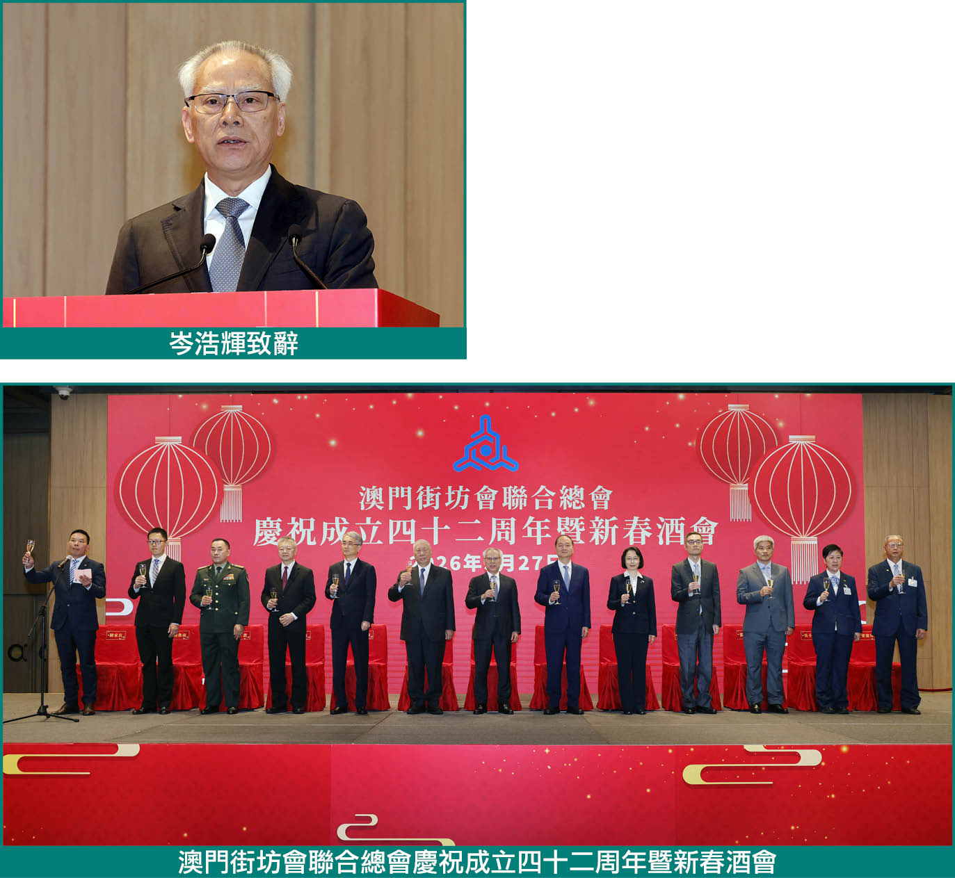 【本報訊】行政長官岑浩27日出席慶祝澳門街坊會聯合總會成立42周年暨新春酒會。他致辭時表示,希望本澳各愛國愛澳社團緊緊圍繞澳門特區的重點發展建設任務,尤其是在推動經濟適度多元發展方面,擔當新角色,拓展新職能,敢於新嘗試,作出新貢獻。同時,聚民意、匯民智,重點就特區“三五”規劃的編製工作建真言獻良策,共同繪製澳門特區未來五年發展的美好藍圖。