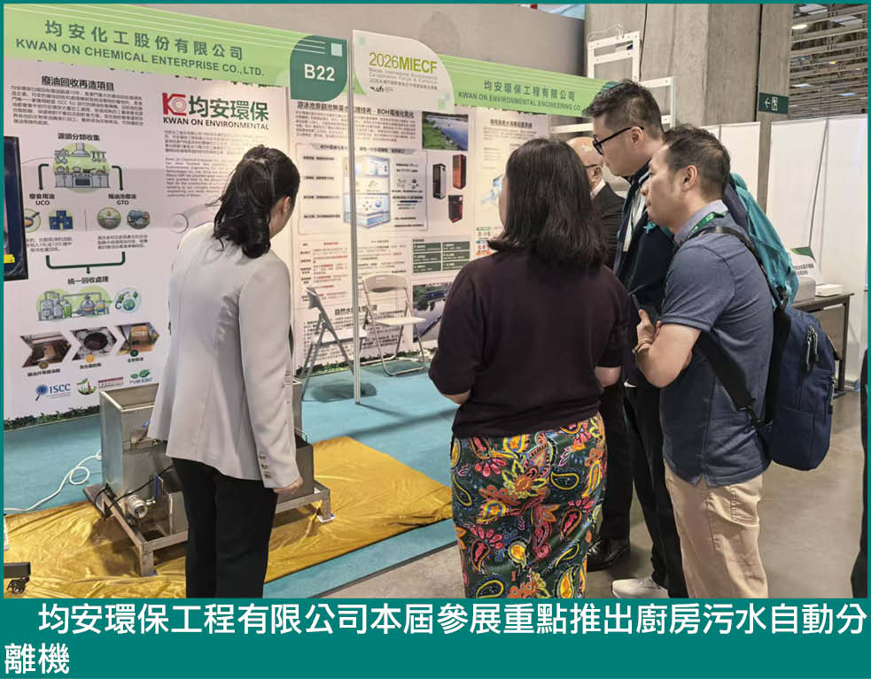陸世安表示,每屆環保展該企業均會推出一個主題及新研發生產的設備,今年的主題包括無需吸污車清理是隔油井、生蠔安全臭氧殺菌。無藥泳池景觀池處理三個方面。他介紹,繼去年參展的大型下水道去污設備,今屆展出具有較高技術含量,適用於各類廚房的廚房污水自動分離機。該設備具有面積不大,但可以將廚房排出的污水與油分離,分離後的油可以再利用,通過處理成為生物柴油有點與功能。