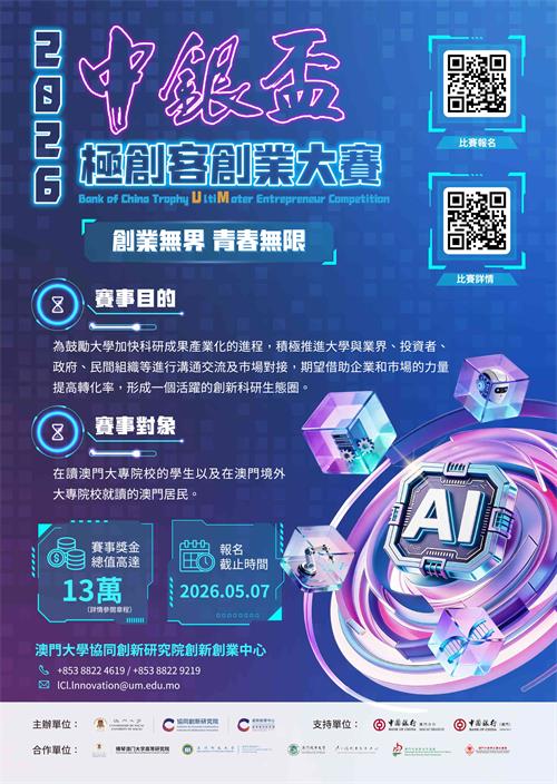 有興趣的合資格人士可由即日起至2026年5月7日登入:https://umac.questionpro.com.au/t/ARuH2ZSBNf報名,詳情可瀏覽:https://cie.ici.um.edu.mo/zh/event-zh/2026-ultimater-cp/。如有查詢,請與澳大創新創業中心聯絡(電話:+853 8822 4619或8822 9429;電郵:ICI.Innovation@um.edu.mo)。