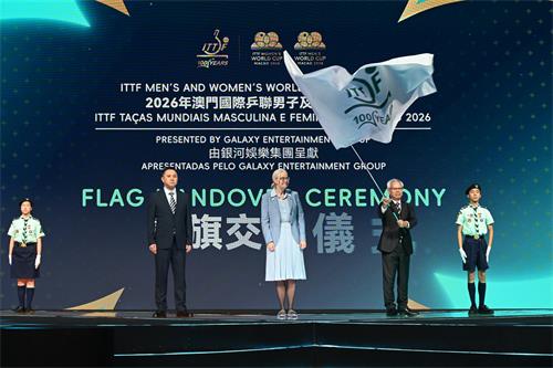 行政長官岑浩輝將2026年澳門國際乒聯男子及女子世界盃賽旗交予國際乒聯代表