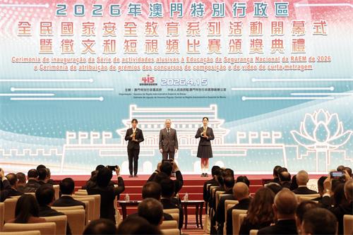 澳門特別行政區政府與澳門中聯辦合辦的全民國家安全教育系列活動,今日傍晚在中國與葡語國家商貿合作服務平台綜合體舉行開幕式,並舉行徵文和短視頻比賽頒獎典禮。由岑浩輝,全國政協副主席何厚鏵,中央港澳辦副主任、國務院港澳辦副主任、澳門中聯辦主任、澳門特別行政區維護國家安全委員會國家安全事務顧問鄭新聰,外交部駐澳特派員公署特派員卞立新、中國人民解放軍駐澳門部隊司令員陳文勝主禮,出席的政府官員及社會各界人士約480人。