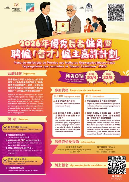 【本報訊】為表揚長者在不同工作崗位上的卓越表現,及對聘用長者僱員的商戶、機構或單位作出公開嘉許,藉以促進社會各界對長者就業能力的認同,為長者提供更多的就業機會。由勞工事務局(下稱“勞工局”)與社會工作局(下稱“社工局”)合辦、社會保障基金協辦的“2026年優秀長者僱員暨聘僱“耆才”僱主嘉許計劃”於4月20日至5月22日接受提名。