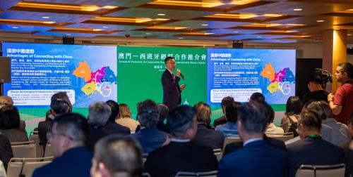 謝永強在“澳門—西班牙經貿合作推介會”介紹澳門營商環境及中葡平台優勢