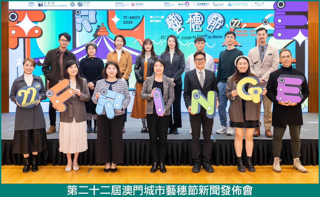 第二十二屆澳門城市藝穗節新聞發佈會於2024年12月29日在文化中心會議室舉行,文化局局長梁惠敏、副局長張麗珊及鄭繼明、演藝活動處處長陳淑美,以及參與的藝團和藝術工作者等出席。