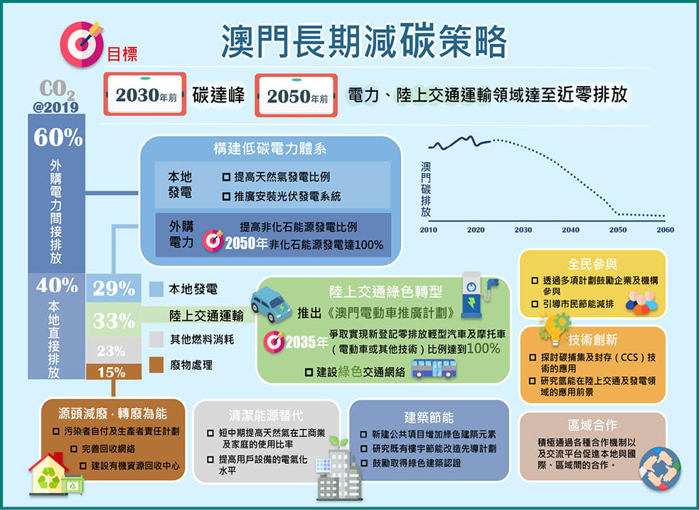 為此,特區政府參考相關研究並綜合分析國際趨勢、經驗、澳門減碳工作的進展,以及相關部門及團體的意見,完成制訂《澳門長期減碳策略》,提出以“分領域、分階段積極落實減碳措施”作為澳門長期減碳發展的總體方向,以及“2030年前達到碳達峰,並推動電力、陸上交通運輸領域優先於2050年前達至近零排放”的總體目標。