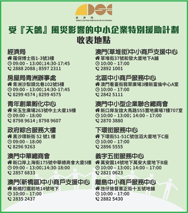 此外,經濟局正聯同其他部門以及商會人員持續“送服務上門”,到各區瞭解受災商戶面對的困難,協助中小微企申請以及提供技術支援。查詢請致電2888-2088/ 8597-2311、或瀏覽經濟局網站和微信公眾號(DSEMACAU)。