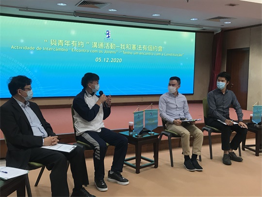 在交流環節上,兩位嘉賓與現場青年學生闡述了憲法的作用和重要性,深入淺出解答有關澳門青年學好《憲法》、在澳推廣《憲法》和基本法的方法等問題,並分享自身投身法律事務工作的歷程,亦就《基本法》關於人權保障與國家安全等方面進行了交流,並勉勵青年應身體力行了解兩法,關注國家發展趨勢,並表示兩法是實現夢想的保障。老柏生在總結時,勉勵青年應親身學習《憲法》與《基本法》,主動瞭解國情並抓緊各種發展機遇,並向身邊的朋友傳遞正確的信息,共同擁護“一國兩制”實踐行穩致遠。教青局一直重視青年的兩法教育,今後將繼續透過豐富多樣的活動,讓青年及學生感受澳門在貫徹實施《基本法》後在日常生活所帶來豐碩成果,切實提升青年及學生對國家的認同感和歸屬感。