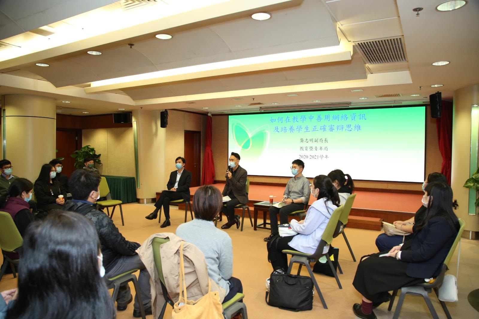 龔志明以輕鬆互動的方式,與教師回饋及分享,了解教師對現今教育模式改變的看法及建議。他指出在獲取網絡資訊時,應以資訊來源及詳細閱讀等方式辨別真偽,亦帶出網絡資訊對教師角色的影響和挑戰、網絡文化對學生的影響,以及如何培養學生正確價值觀。多位教學人員於講座中發言,彼此交換意見及心得,相互啟發。