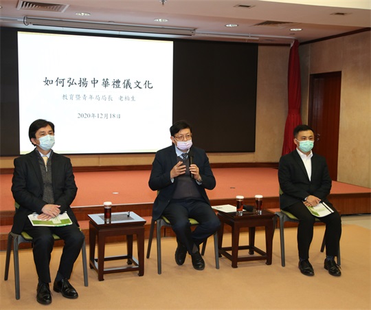 【本報訊】中國自古以來以“禮儀之邦” 聞名於世,禮樂文化從古至今,源遠流長,為推動中華傳統文化傳承發展,教育暨青年局於2020年12月18日(星期五)晚在仲尼堂舉辦以中華禮儀文化教育為主題的“與教師有約”講座。教青局局長老柏生在會上分享優秀的禮儀文化,分析弘揚中華禮儀文化的重要性,出席講座的還有教青局代副局長黃健武及黃嘉祺。