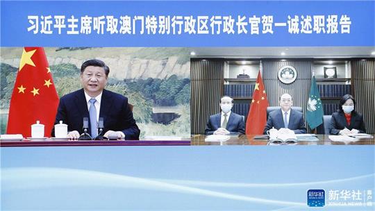 行政長官下午述職時,習近平主席說,因為疫情防控需要,所以採取視頻方式聽取行政長官對2020年工作的述職報告。習近平主席表示,2020年是行政長官和新一屆澳門特別行政區政府的開局之年,面對突如其來的新冠肺炎疫情,行政長官和特區政府快速反應、措施有力,在較短時間內控制住了疫情,至今已連續超過300天沒有本地新增確診病例,贏得了澳門市民和各有關方面的高度讚譽;在防控疫情的同時,特區政府採取有力措施恢復經濟、紓解民困,取得了積極成效,促進了澳門社會和諧,中央對行政長官和澳門特區政府的工作是充分肯定的。