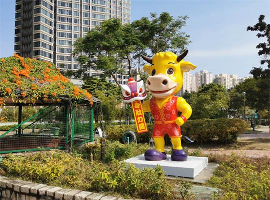 辛丑年生肖牛塑像高約三米,設計意涵取自金牛之健壯有力,面相表情精神飽滿,雙目神采飛揚,身姿強壯結實,披上新春傳統特色服飾,手持寫上身壯力健揮春的醒獅頭,寓意身壯力健。