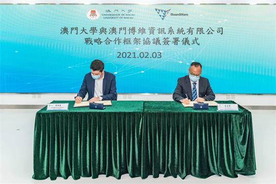 【本報訊】澳門大學與澳門博維資訊系統有限公司(簡稱“澳門博維”)於2月3日假澳大智慧城市物聯網國家重點實驗室多功能廳簽署戰略合作框架協議。雙方將共同建設澳門大學—澳門博維聯合實驗室,透過整合研發實力及資源優勢,培養更多高端人才,為澳門創造更多科技成果。