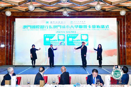 【本報訊】3月28日,澳門國際銀行與澳門城市大學聯營信用卡發佈儀式假澳門美高梅酒店舉行,澳門國際銀行胡倫副總經理、澳門國際銀行汪洋零售業務總監、澳門城市大學劉駿校長、澳門城市大學陳倩雯協理副校長主禮啟動新卡發佈。