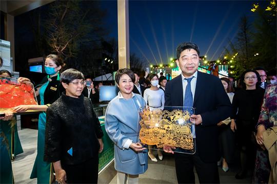 梁安琪(左二)在澳門特區政府旅遊局局長文綺華(左一)陪同下於參觀主題展場後向杭州市人民政府副市長柯吉欣(右一)致送以「京」典傳承為題的紀念品