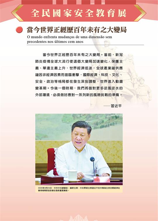 在“百年未有之大變局下的國家安全”章節中,引述了習近平主席於2020年的講話。他表示,當今世界正經歷百年未有之大變局。當前,新冠肺炎疫情全球大流行使這個大變局加速變化,保護主義、單邊主義上升,世界經濟低迷,全球產業鏈供應鏈因非經濟因素而面臨衝擊,國際經濟、科技、文化、安全、政治等格局都在發生深刻調整,世界進入動盪變革期。今後一個時期,我們將面對更多逆風逆水的外部環境,必須做好應對一系列新的風險挑戰的準備。