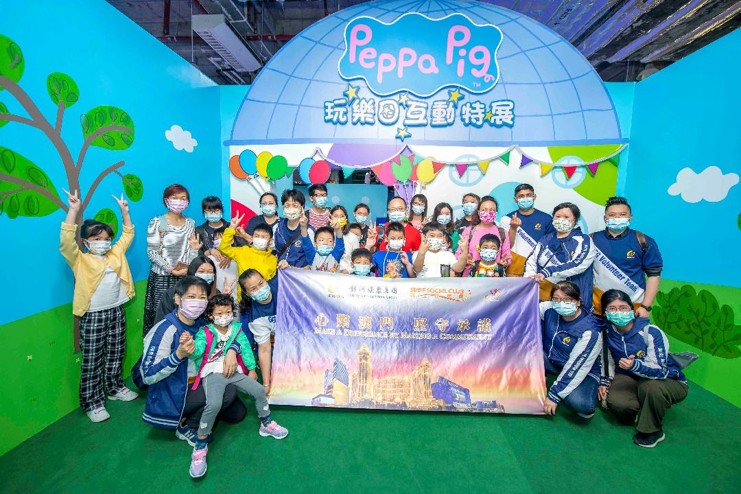早前,來自自閉症協會及家協的參與家庭,逾 60 名參加者隨著銀娛安排的專車抵達澳門百老匯參觀新設的“Peppa Pig玩樂日互動特展”,與深受小朋友喜愛的卡通人物Peppa Pig和她的家人和朋友們共度歡樂時光。此展覽於4月開始舉辦至6月中旬,以1:1 比例還原了多個動畫場景,並設有大量的互動裝置及遊戲;一眾參與家庭成員在銀娛義工的陪同下,暢玩多個遊樂設施,並與各個卡通角色合照留念。過程中,銀娛義工們與自閉症及其他有特別需要的人士互動,建立友誼。