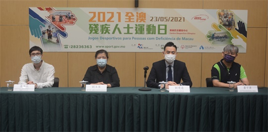 體育局今(6)日於辦公樓會議室召開記者會,公佈“2021全澳殘疾人士運動日”細節。出席活動記者會的嘉賓包括體育局副局長劉楚遠、澳門聾人體育會會員大會主席劉玉英、澳門特殊奧運會執行總監蕭宇康以及中國澳門殘疾人奥委會暨傷殘人士文娛暨體育總會代表唐海欣。