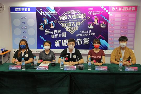 新聞發佈會由澳門無疆界青年協會理事長李永漢先生、「第八屆全澳大專院校歌 唱大賽」籌委會主席張彤彤女士、澳門特殊奧運會社區支援服務經理曾巧瓏女士、聖若瑟大學學生及校友事務部主任湯慧瑩女士及澳門理工學院學生會外務副理事長李灝 軒先生擔任主講嘉賓,介紹活動目的及內容。