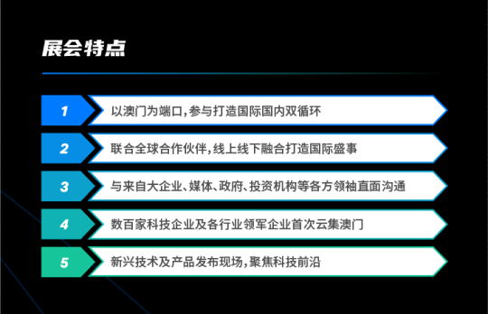 以澳門為端口,參與打造國際國內死循環;聯合全球合作夥伴,線上線下融合打造國際盛事;’與來自大企業、媒體、政府、投資機構等各方領袖直面溝通;數百家科技企業及各行業領軍企業首次雲集澳門;新興技術及產品發佈現場,聚焦科技前沿。