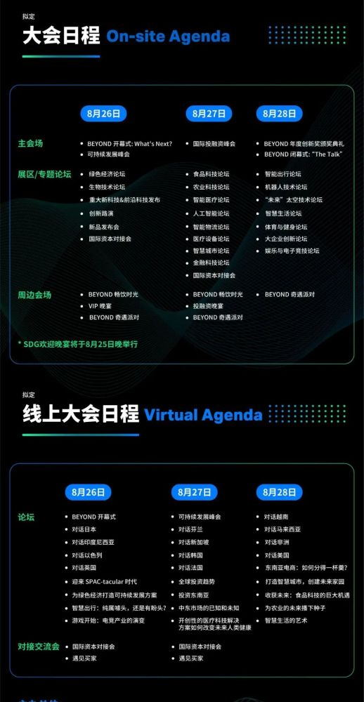 同期配套舉行開幕式和多個垂直論壇關注科技對各產業的影響,線上線下雙重形式開展,開幕式將邀請全球頂級嘉賓參與分享行業風向以及創新趨勢,垂直論壇則深入剖析和挖掘涉及綠色經濟、節能環保、農業與食品科技、醫療、健康、生命科學、未來出行、智慧城市、5G物聯網、金融科技、智慧生活、消費升級、未來科技等垂直領域,以及舉辦投融資、政府合作、商務合作等對接會,促進行業內高效對接及交流,以及創新走訪和更多輕鬆的聚會派對,為與會者營造更多交流溝通的場景。