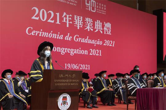 宋永華致辭時指,2021年是澳大40週年校慶,學子們適逢在這一時間節點畢業,具有特殊意義。儘管目前還沒有徹底走出新冠肺炎疫情的陰霾,但是一切都正在往好的方向發展。澳門在回歸祖國之前,經濟蕭條、社會治安不靖。當時畢業的校友儘管面對充滿迷茫和困惑的前景,但他們以積極的心態和堅定的意志,不懈努力和奮鬥,一步一腳印走到了現在,當中不少人已在社會獨當一面,成為棟樑之才,甚至憑著卓越的貢獻和成就獲得社會認可、榮獲特區授勛,他們都是我們的好榜樣。此外,宋永華分享了三點想法勉勵學生:第一,不畏困難、砥礪前行;第二,志存高遠、腳踏實地;第三,把握機遇,謀求發展。