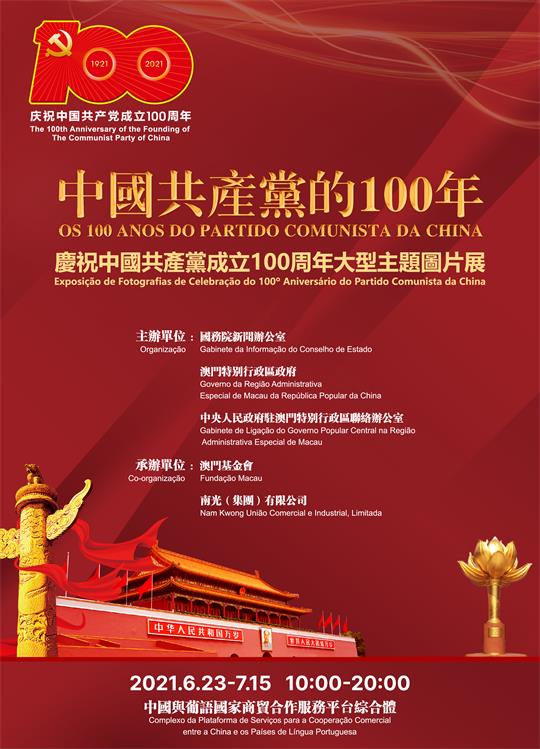 【本報訊】由國務院新聞辦公室、澳門特別行政區政府、中央人民政府駐澳門特別行政區聯絡辦公室主辦,澳門基金會、南光(集團)有限公司承辦的“中國共產黨的100年——慶祝中國共產黨成立100周年大型主題圖片展”,將於6月23日上午在中國與葡語國家商貿合作服務平臺綜合體開展,屆時邀請中央駐澳機構、特區政府相關部門、澳門社會各界代表出席開展儀式。