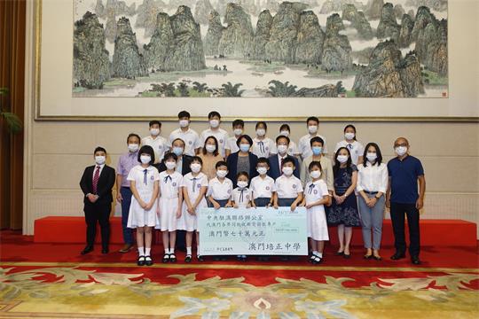 7月23日下午,中央政府駐澳門聯絡辦公室副主任嚴植嬋在辦公樓會見培正中學校長高錦輝等師生一行24人,代收該校學生捐款澳門幣70萬元。