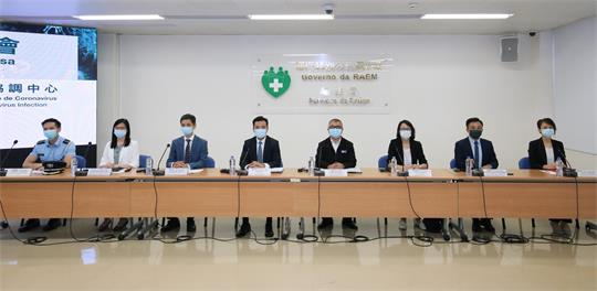 【本報訊】新型冠狀病毒感染應變協調中心(下稱應變協調中心)於8月4日舉行記者會,衛生局羅奕龍局長、警察總局王健局長助理、社會工作局許華寶副局長、仁伯爵綜合醫院醫務主任戴華浩醫生、教青局非高等教育廳黃嘉祺廳長、旅遊局公共關係處藍同好處長、治安警察局公共關係處李德輝處長、疾病預防控制中心傳染病防制暨疾病監測部梁亦好協調員共同會見傳媒。