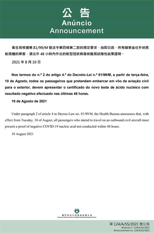 【本報訊】新型冠狀病毒感染應變協調中心(下稱應變協調中心)宣佈,因應疫情變化,由即(10)日起,所有擬乘坐往外地民航飛機的乘客,須出示48小時內作出的新型冠狀病毒核酸檢測陰性結果證明。