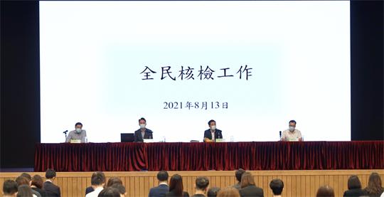 會上,衛生局局長羅奕龍感謝各界對全民核檢計劃的支持,並介紹目前全民核酸檢測的各項跟進工作,包括增加核檢站和採樣點的數目,設置優先通道和關愛核檢站,調整預約系統和數據發布方式,招募醫療義工並開展相關培訓,提供鼻咽或口咽拭子採樣選擇,優化採樣和檢測流程,增加站點內的醫療和相關硬件設備等。教青局副局長龔志明介紹各核檢站的運作流程,包括預約流程和安排、站內登記和秩序措施,協助衛生局制定各核檢站運作的相關工作指引,期望讓整個全民核酸檢測流程更順暢。同時,衛生局亦十分感謝社會工作局的協助,尤其幫助有困難人士進行外展核酸檢測工作,以及支援各核檢站的後勤工作。
