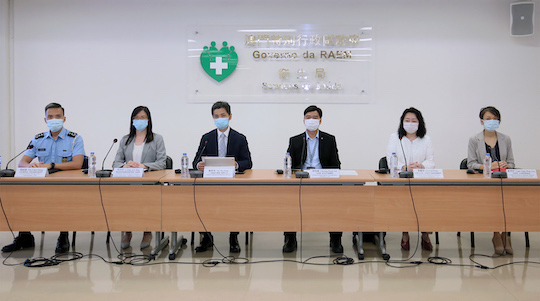 【本報訊】新型冠狀病毒感染應變協調中心(下稱應變協調中心)於8月17日舉行記者會,仁伯爵綜合醫院醫務主任戴華浩醫生、市政署食品安全廳張桂達廳長、社會工作局家庭及社區服務廳李麗萍廳長、旅遊局公共關係處藍同好處長、治安警察局行動及通訊處馬超雄處長、疾病預防控制中心傳染病防制暨疾病監測部梁亦好協調員共同會見傳媒。