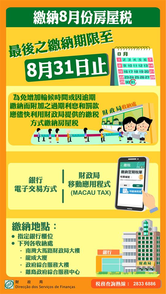 【本報訊】財政局提醒房屋稅納稅人,如收到之2020年度房屋稅徵稅憑單上所載之繳納月份為8月,最後之繳納期限至8月31日止,為免因逾期繳納而附加之過期利息和罰款,財政局呼籲倘仍未繳納上述房屋稅之納稅人,請儘快利用財政局提供的繳稅方式繳納房屋稅,亦可於辦公時間內,到指定銀行櫃位,以及透過銀行提供電子交易方式,另外,可使用財政局移動應用程式(MACAU TAX)掃瞄徵稅憑單上之二維碼,利用有關移動支付平台繳交稅款,或於財政局大樓、龍成大廈、政府綜合服務大樓及離島政府綜合服務中心收納處繳交,為便於繳納,納稅人憑澳門居民身份證於財政局及身份證明局之自助服務機,可列印稅單摘要,資料可供自動櫃員機及銀行提供電子交易繳納稅款,又或者於財政局自助服務機補印稅單交稅。
